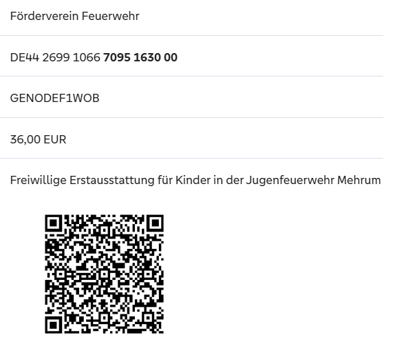 Über diesen QR Code können Sie eine Fotoüberweisung tätigen. Der Code kann mit den meisten gängigen Online-Banking Apps gescannt werden und trägt alle notwendigen Daten für die Überweisung von 36,00 Euro automatisch ein. Jeder Beitrag zählt!